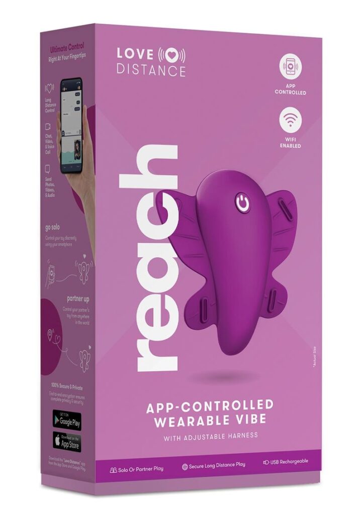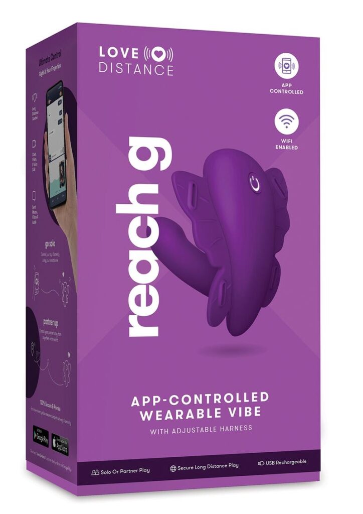Hit all of the right spots with Reach G, a wearable vibe that puts control right in your hands with the Love Distance App. It features a comfortably fitting elastic harness and a special design that combines G-spot stimulation with a broad winged base that powerfully buzzes externally especially the clit. This discreet vibe also comes with a satin travel case and USB charging cord for the ultimate convenience.
