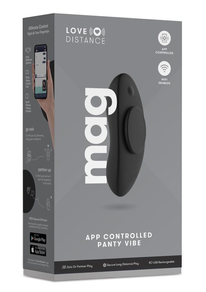 Take intimate pleasure with you anywhere you go with the most discreet panty vibe that can be controlled right from your smartphone. The Love Distance Mag App-Controlled Panty Vibe offers 20 powerful vibrating functions with 12 speeds with a smooth, contoured shape that nuzzles up to the body to provide direct stimulation. A magnet securely and discreetly keeps the vibe in place for hands-free, on-the-go stimulation.