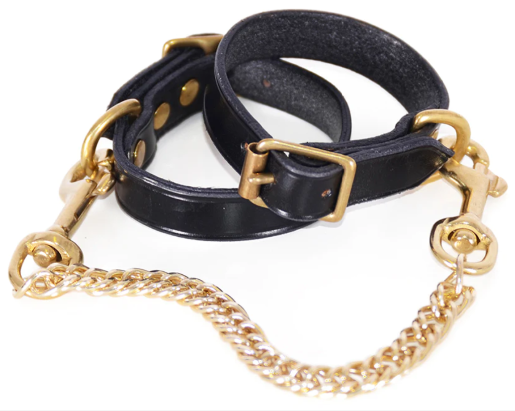 Bondage but make it luxury. These Half Inch Leather Handcuffs are crafted from quality leather by a British female saddler and forged with gleaming metal work. Each pair of cuffs has a detachable gold metal chain so you can wear them separately as bracelets of single leather cuffs. If you want to explore the world of kink these are the perfect addition to your play. Surrender or take control, you decide.