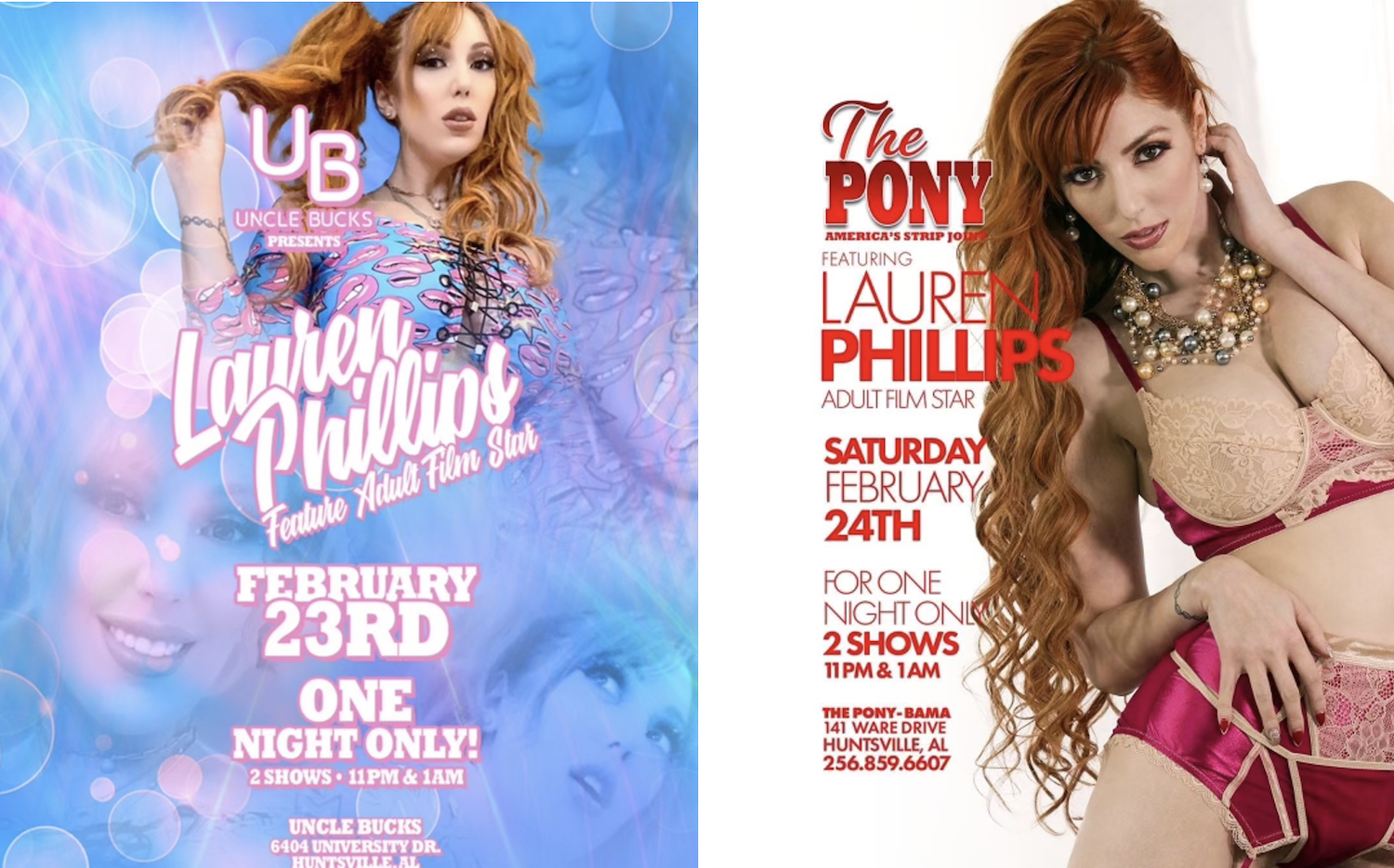 On February 23, 2024 by Adult All AccessArticle Courtesy of The Rub PR (Hollywood, CA) Sexy, statuesque, fiery redhead influencer, gamer, and multi-award-winning adult actress and director Lauren Phillips is ready to rock Alabama with features at Uncle Bucks on Friday, February 23rd, and The Pony-Bama on Saturday, February 24th. This weekend, Huntsville, Alabama, is THE place to be if you’re a Lauren