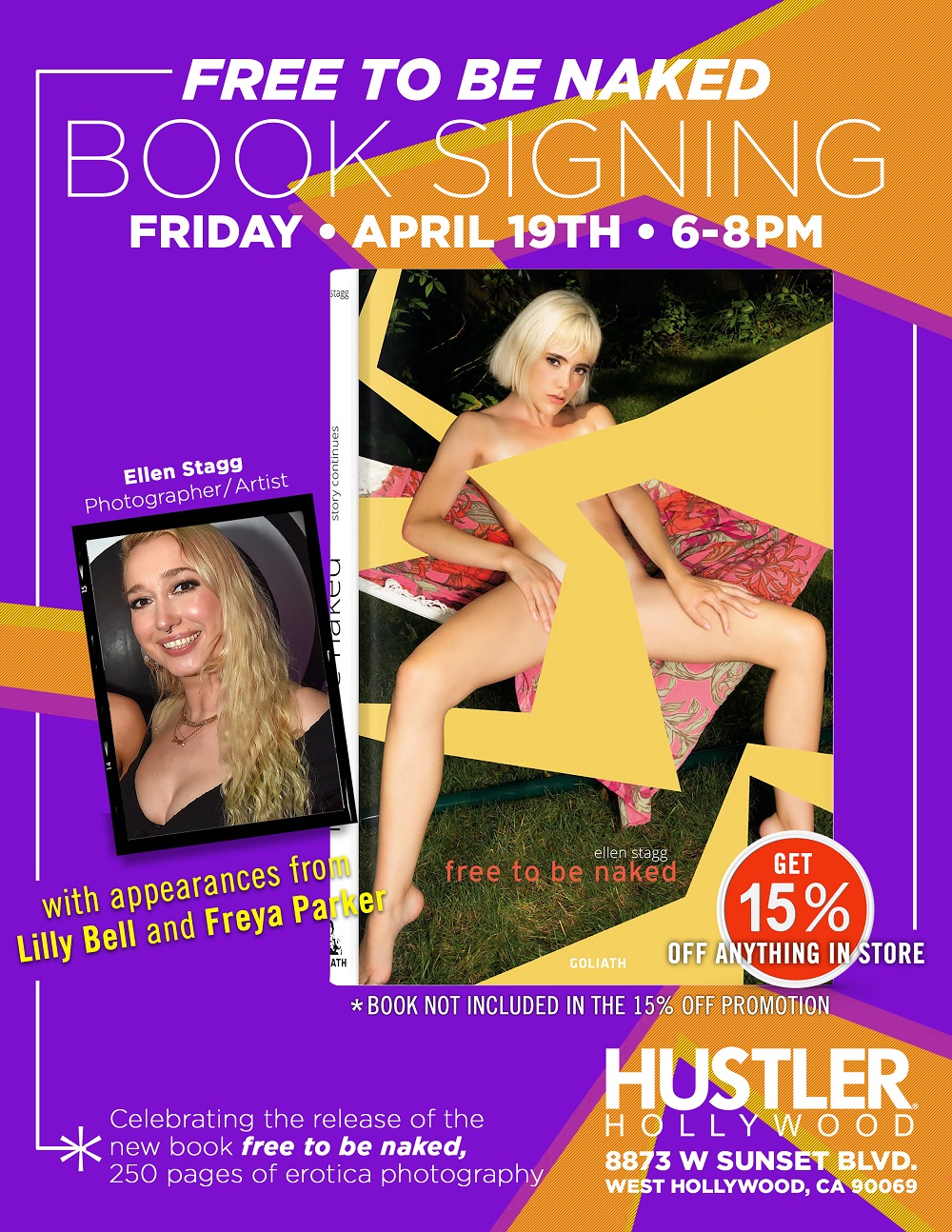 On April 18, 2024 by Adult All AccessArticle Courtesy of BSG PR (Brooklyn, NY / April 16, 2023) — Ellen Stagg is headed to the Sunset Strip in Los Angeles, California for an in-store signing event in celebration of her latest photo hardcover, Free to Be Naked, at the Hustler Hollywood Store in West Hollywood (8873 W Sunset Blvd.) on Friday, April 19th,