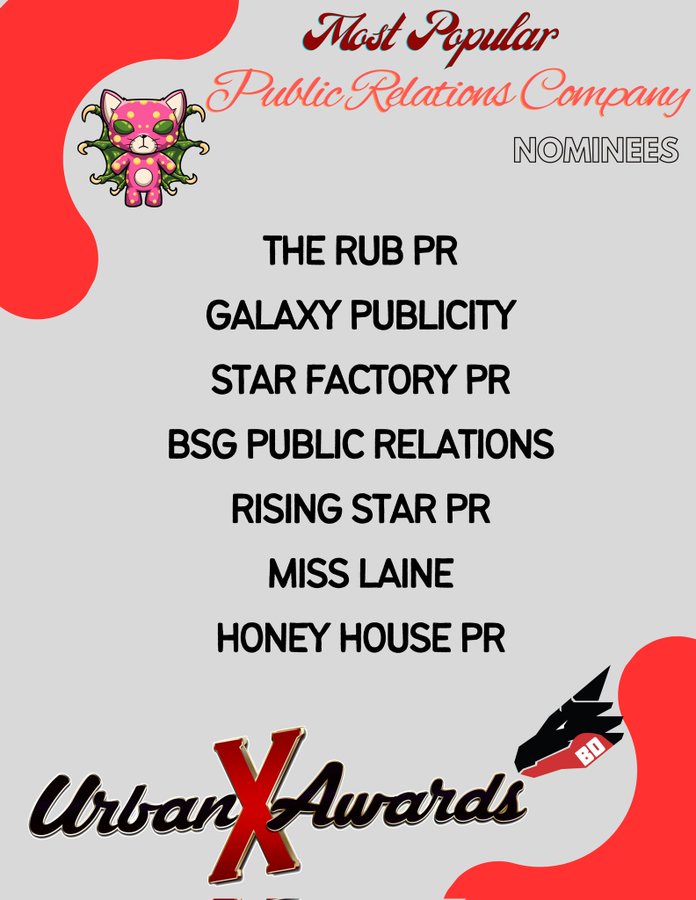 “We’re honored to be nominated the Most Popular Adult PR Company category this year,” said company owner and industry veteran DCypher. “It feels great to be recognized for all the hard work we put in for our clients behind the scenes, providing top-tier publicity services and helping them grow their brands and get maximum exposure. We are grateful for the acknowledgment of our passion for our clients. Thanks to everyone at Urban X and congratulations to all the other nominees!”