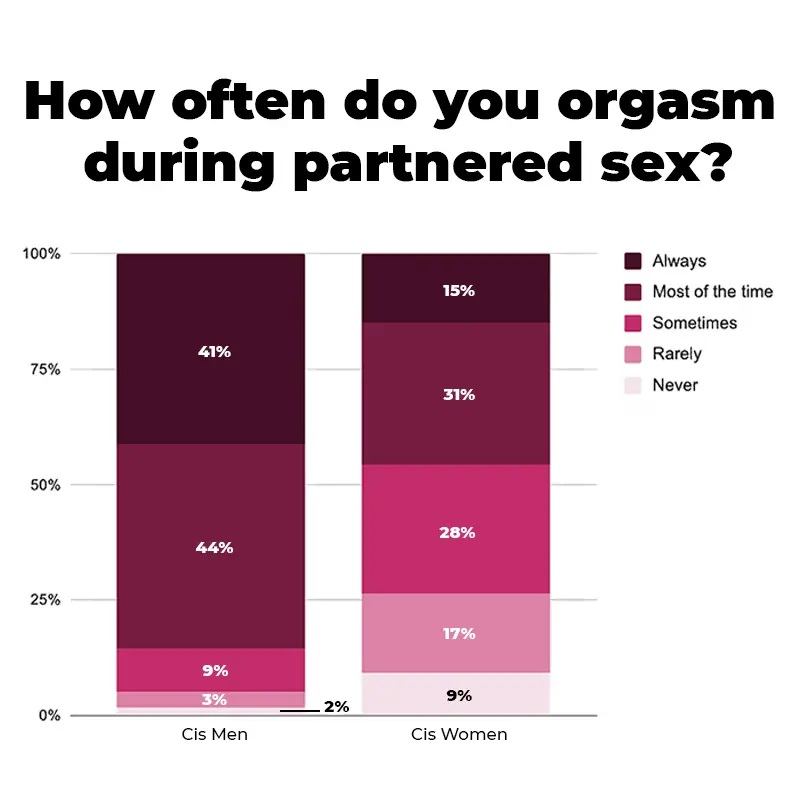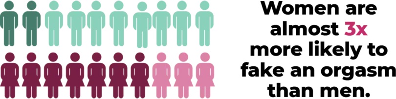 The survey calculations report that men are almost twice as likely to orgasm regularly during straight sex than women (85% vs. 46%), but when it comes to masturbation, the orgasm gap disappears (86% vs. 88%). Women also admit to faking orgasms three times more often than men (23% vs. 58%) for fear of “hurting my partner’s feelings” (23%), “I’m tired and want to end sex” (14%) and “I feel pressured to orgasm every time because of society’s and/or my partner’s expectations (13%).